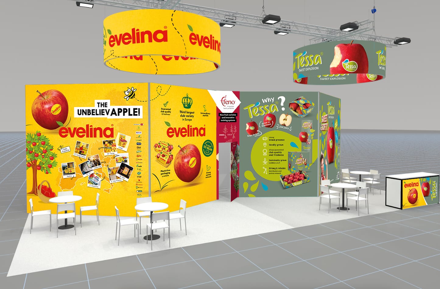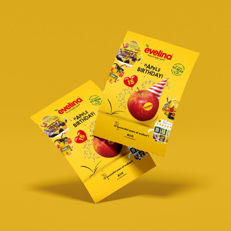 Attraente per forma e colori, dal rosso intenso alle sfumature di giallo, ti sorprende per il suo sapore fresco ad ogni assaggio, riportando alla mente le emozioni più autentiche della natura: è Evelina! Per lei abbiamo disegnato il logo, l’abbiamo vestita con bollino e packaging e raccontata attraverso stand fieristici, merchandising e pubblicità! E tu hai un frutto a cui dare una personalità?